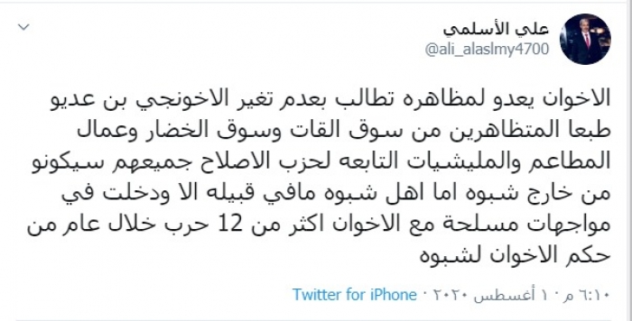 وكتب "الأسلمي" في تغريدة عبر حسابه بتويتر، رصدها "المشهد العربي": "الإخوان يعدون لمظاهرة تطالب بعدم تغيير الإخونجي بن عديو، طبعا المتظاهرون من سوق القات وسوق الخضار وعمال المطاعم والمليشيات التابعة لحزب الإصلاح جميعهم سيكونون من خارج شبوة أما أهل شبوة ما في قبيلة إلا ودخلت في مواجهات مسلحة مع الإخوان أكثر من 12 حربا خلال عام من حكم الإخوان لشبوة".
