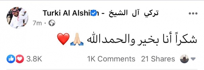 وكتب آل الشيخ عبر صفحته الشخصية اليوم الأحد، "فيسبوك" تدوينة قال فيها: "الحمد الله أنا بخير".