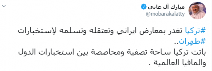 وكتب عبر تغريدة له على "تويتر" رصدها " المشهد العربي": "تركيا تغدر بمعارض ايراني وتعتقله وتسلمه لاستخبارات طهران، باتت تركيا ساحة تصفية ومحاصصة بين استخبارات الدول والمافيا العالمية".