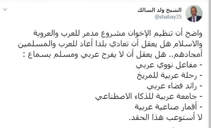وكتب عبر تغريدة له على "تويتر" رصدها " المشهد العربي": "واضح أن تنظيم الإخوان مشروع مدمر للعرب والعروبة والإسلام هل يعقل أن تعادي بلدا أعاد للعرب والمسلمين أمجادهم".