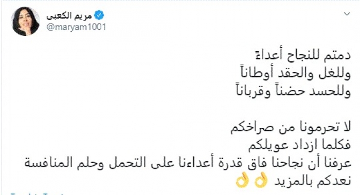 وقالت في تغريدة عبر "تويتر" رصدها "المشهد العربي": "دمتم للنجاح أعداءً وللغل والحقد أوطاناً وللحسد حضناً وقرباناً لا تحرمونا من صراخكم فكلما ازداد عويلكم عرفنا أن نجاحنا فاق قدرة أعداءنا على التحمل وحلم المنافسة نعدكم بالمزيد".