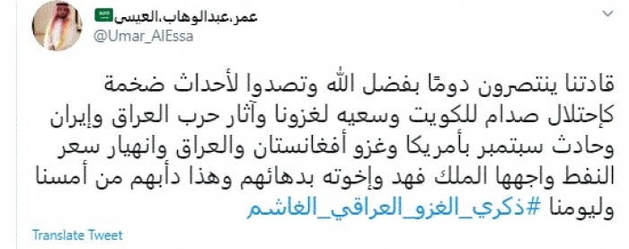 وقال في تغريدة عبر "تويتر" رصدها "المشهد العربي": "قادتنا ينتصرون دومًا بفضل الله وتصدوا لأحداث ضخمة كاحتلال صدام للكويت وسعيه لغزونا وآثار حرب العراق وإيران".