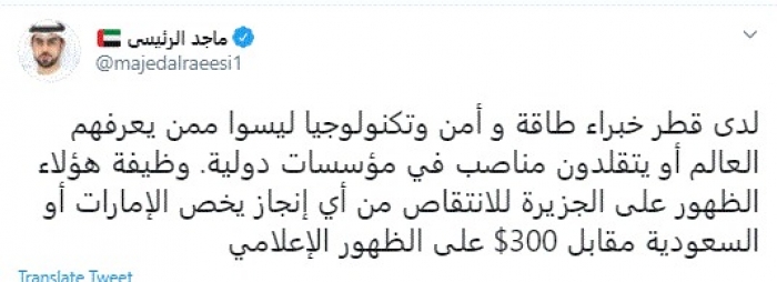 وأضاف: "وظيفة هؤلاء الظهور على الجزيرة للانتقاص من أي إنجاز يخص الإمارات أو السعودية مقابل 300$ على الظهور الإعلامي".