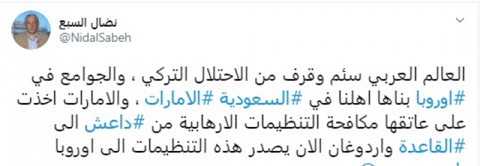 وكتب في تغريدة عبر "تويتر" رصدها "المشهد العربي": "العالم العربي سئم وقرف من الاحتلال التركي، والجوامع في أوروبا بناها أهلنا في السعودية والإمارات".
