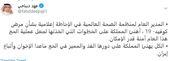 وقال في تغريدة عبر "تويتر" رصدها "المشهد العربي": "المدير العام لمنظمة الصحة العالمية في الإحاطة إعلامية بشأن مرض كوفيد- 19، أهنئ المملكة على الخطوات التي اتخذتها لجعل عملية الحج هذا العام آمنة قدر الإمكان".
