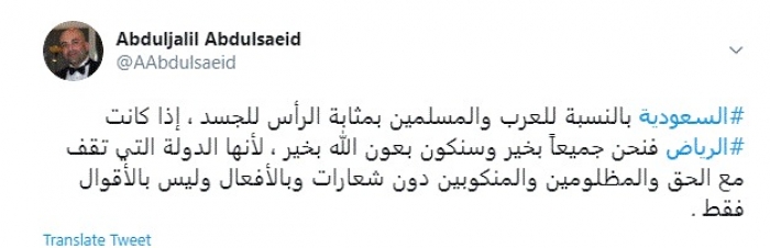 وكتب في تغريدة عبر "تويتر" رصدها "المشهد العربي": "السعودية بالنسبة للعرب والمسلمين بمثابة الرأس للجسد، إذا كانت الرياض فنحن جميعاً بخير وسنكون بعون الله بخير، لأنها الدولة التي تقف مع الحق والمظلومين والمنكوبين دون شعارات وبالأفعال وليس بالأقوال فقط".