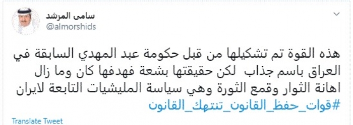 وقال في تغريدة عبر "تويتر" رصدها "المشهد العربي": "هذه القوة تم تشكيلها من قبل حكومة عبد المهدي السابقة في العراق باسم جذاب لكن حقيقتها بشعة فهدفها كان وما زال إهانة الثوار وقمع الثورة وهي سياسة المليشيات التابعة لإيران".