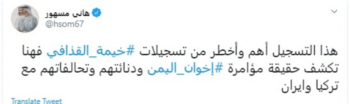 وقال في تغريدة عبر "تويتر" رصدها "المشهد العربي": "هذا التسجيل أهم وأخطر من تسجيلات خيمة القذافي فهنا تكشف حقيقة مؤامرة إخوان اليمن ودنائتهم وتحالفاتهم مع تركيا وايران".