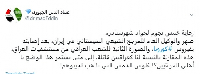 وقال في تغريدة عبر "تويتر" رصدها "المشهد العربي": " رعاية خمس نجوم لجواد شهرستاني، صهر والوكيل العام للمرجع الشيعي السيستاني في إيران، بعد إصابته بفيروس كورونا، والصورة الثانية للشعب العراقي من مستشفيات العراق، هذه المقارنة بالنسبة لنا كعراقيين قاتلة، إلى متى يستمر هذا الوضع يا أهلي العراقيين؟! فلوس الخمس التي تذهب لجيبوهم".