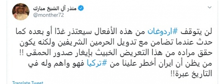 هاجم المدون السعودي البارز منذر آل الشيخ مبارك، اليوم، الرئيس التركي رجب طيب أردوغان بعد تطاوله على الكعبة المشرفة.