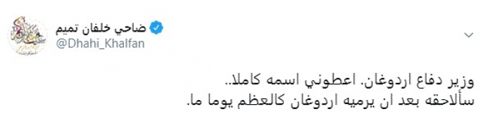 وقال في تغريدة عبر "تويتر" رصدها "المشهد العربي": "وزير دفاع أردوغان. أعطوني اسمه كاملا.. سألاحقه بعد أن يرميه اردوغان كالعظم يومًا ما".