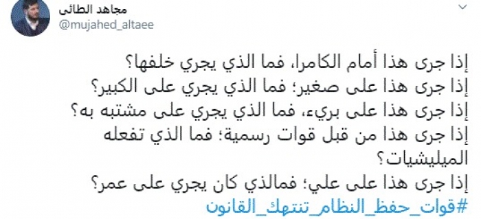 وقال في تغريدة عبر "تويتر" رصدها "المشهد العربي": "إذا جرى هذا أمام الكاميرا، فما الذي يجري خلفها؟... إذا جرى هذا على صغير؛ فما الذي يجري على الكبير؟... إذا جرى هذا على بريء، فما الذي يجري على مشتبه به؟".