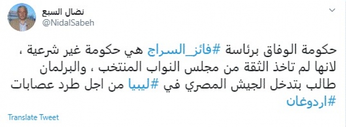 وقال في تغريدة عبر "تويتر" رصدها "المشهد العربي": "حكومة الوفاق برئاسة فائز السراج هي حكومة غير شرعية، لأنها لم تاخذ الثقة من مجلس النواب المنتخب".