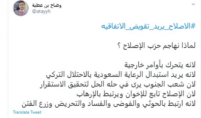 وكتب في تغريدة عبر "تويتر" رصدها "المشهد العربي": "لماذا نهاجم حزب الإصلاح؟.. لأنه يتحرك بأوامر خارجية.. لأنه يريد استبدال الرعاية السعودية بالاحتلال التركي".