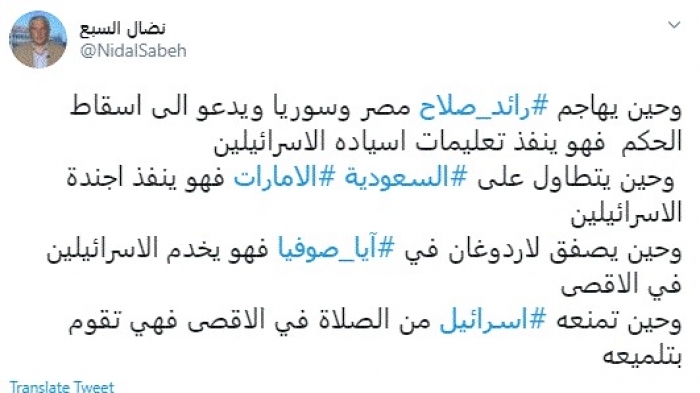 وقال في تغريدة عبر "تويتر" رصدها "المشهد العربي": "وحين يهاجم رائد صلاح مصر وسوريا ويدعو إلى إسقاط الحكم فهو ينفذ تعليمات أسياده الإسرائيلين وحين يتطاول على السعودية والإمارات فهو ينفذ أجندة الإسرائيلين".