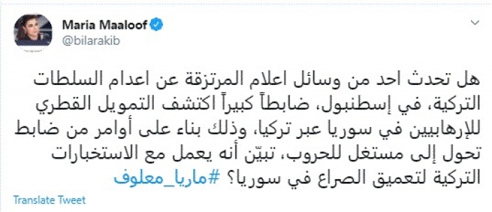 وقالت في تغريدة عبر "تويتر" رصدها "المشهد العربي": "هل تحدث احد من وسائل اعلام المرتزقة عن اعدام السلطات التركية، في إسطنبول، ضابطاً كبيراً اكتشف التمويل القطري للإرهابيين في سوريا عبر تركيا، وذلك بناء على أوامر من ضابط تحول إلى مستغل للحروب، تبيّن أنه يعمل مع الاستخبارات التركية لتعميق الصراع في سوريا؟".