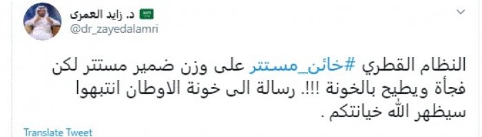 وقال في تغريدة عبر "تويتر" رصدها "المشهد العربي": "النظام القطري خائن مستتر على وزن ضمير مستتر لكن فجأة ويطيح بالخونة".