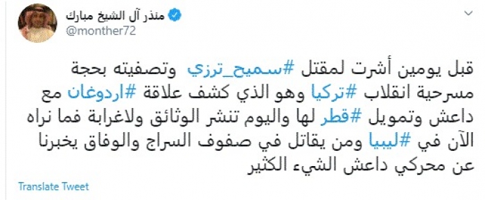 وقال في تغريدة عبر "تويتر" رصدها "المشهد العربي": "قبل يومين أشرت لمقتل سميح ترزي وتصفيته بحجة مسرحية انقلاب تركيا وهو الذي كشف علاقة أردوغان مع داعش وتمويل قطر لها واليوم تنشر الوثائق".