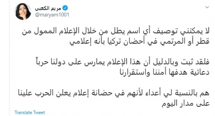 وجهت الإعلامية والكاتبة الإماراتية مريم الكعبي، انتقادًا لاذعًا للإعلاميين الممولين من قطر وتركيا، مؤكدةً أنهم يستهدفون هدم أمن واستقرار الدول العربية.