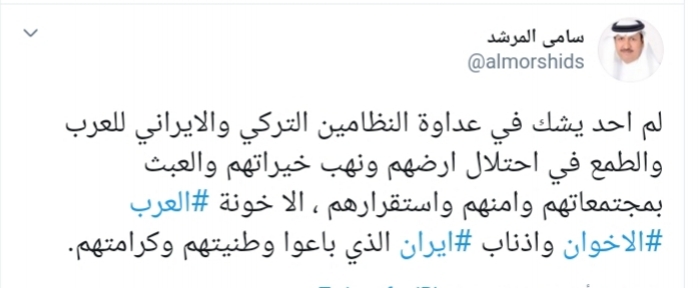وكتب عبر تغريدة له على "تويتر" رصدها " المشهد العربي" :"لم يعد أحد يشك في عداوة النظامين التركي والإيراني للعرب والطمع في احتلال أرضهم ونهب خيراتهم والعبث بمجتمعاتهم وأمنهم واستقرارهم، إلا خونة العرب الإخوان وأذناب إيران الذين باعوا وطنيتهم وكرامتهم".
