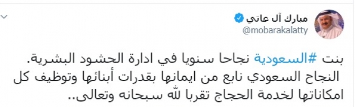 وكتب عبر تغريدة له على "تويتر" رصدها " المشهد العربي": "بنت السعودية نجاحا سنويا في ادارة الحشود البشرية، النجاح السعودي نابع من إيمانها بقدرات أبنائها وتوظيف كل إمكاناتها لخدمة الحجاج تقربا لله سبحانه وتعالى"