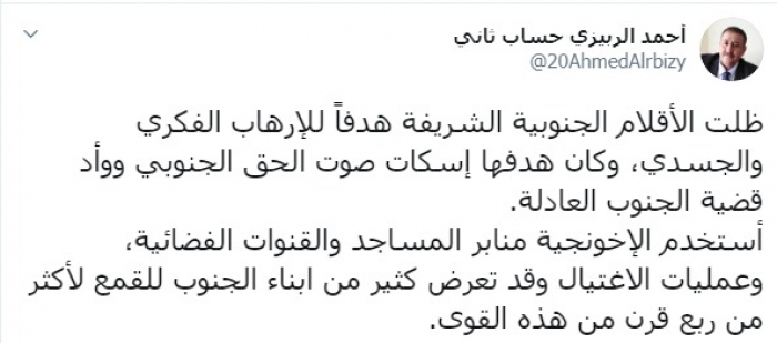 وكتب عبر تغريدة له على "تويتر" رصدها "المشهد العربي": "ظلت الأقلام الجنوبية الشريفة هدفا للإرهاب الفكري والجسدي، وكان هدفها إسكات صوت الحق الجنوبي ووأد قضية الجنوب العادلة، استخدم الإخونجية منابر المساجد والقنوات الفضائية، وعمليات الاغتيال وقد تعرض كثير من أبناء الجنوب للقمع لأكثر من ربع قرن من هذه القوى".