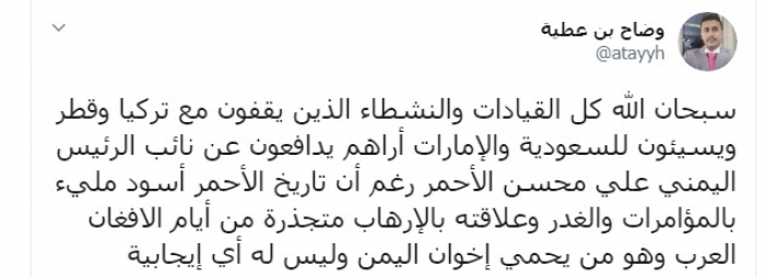 وكتب عبر تغريدة له على "تويتر" رصدها "المشهد العربي": "سبحان الله كل القيادات والنشطاء الذين يقفون مع تركيا وقطر ويسيئون للسعودية والإمارات أراهم يدافعون عن نائب الرئيس اليمني علي محسن الأحمر، رغم أن تاريخ الأحمر أسود مليء بالمؤامرات والغدر وعلاقته بالإرهاب متجذرة من أيام الأفغان العرب وهو من يحمي إخوان اليمن وليس له أي إيجابية".