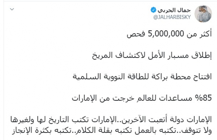 وكتب عبر تغريدة له على "تويتر" رصدها" المشهد العربي": "أكثر من 5,000,000 فحص، إطلاق مسبار الأمل لاكتشاف المريخ، افتتاح محطة براكة للطاقة النووية السلمية، %85 مساعدات للعالم خرجت من الإمارات".