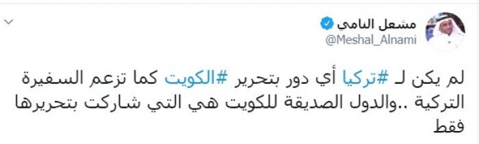 وكتب عبر تغريدة له على "تويتر" رصدها " المشهد العربي":"لم يكن لتركيا أي دور بتحرير الكويت كما تزعم السفيرة التركية، والدول الصديقة للكويت هي التي شاركت بتحريرها فقط".