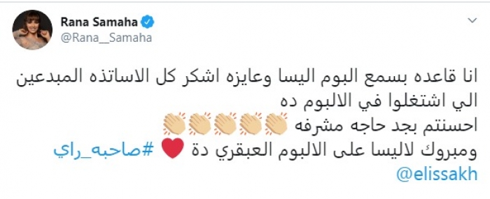وكتبت رنا، عبر حسابها على تويتر: "أنا قاعدة بسمع ألبوم إليسا، وعايزة أشكر كل الأساتذة المبدعين اللي اشتغلوا في الألبوم ده.. أحسنتم بجد حاجة مشرفة.. ومبروك لإليسا على الألبوم العبقري ده.. صاحبة رأي".