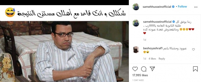 تفاعل الفنان سامح حسين، مع متابعيه وجمهوره بسبب اقتراب إعلان نتيجة الثانوية العامة في مصر.