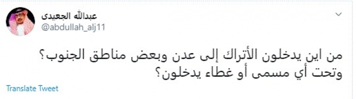 وقال في تغريدة عبر "تويتر" رصدها "المشهد العربي": "من أين يدخلون الأتراك إلى عدن وبعض مناطق الجنوب؟".