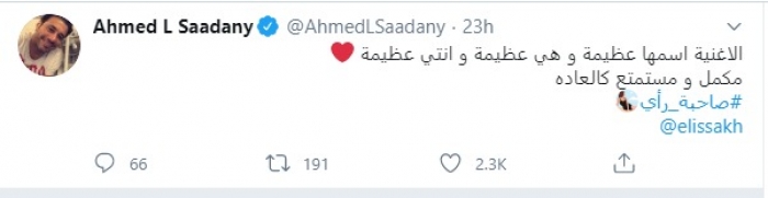وكتب "السعدني" عبر حسابه الرسمي بموقع تويتر: "الأغنية اسمها عظيمة، وهي عظيمة وإنتِ عظيمة، مكمل ومستمتع كالعادة، صاحبة رأي".