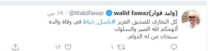 وكتب: "كل التعازي للصديق العزيز باسل خياط في وفاة والده، ألهمكم الله الصبروالسلوان، سبحان من له الدوام".