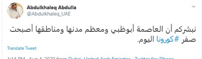 وكتب في تغريدة عبر "تويتر" رصدها "المشهد العربي": "نبشركم أن العاصمة أبوظبي ومعظم مدنها ومناطقها أصبحت صفر كورونا اليوم".