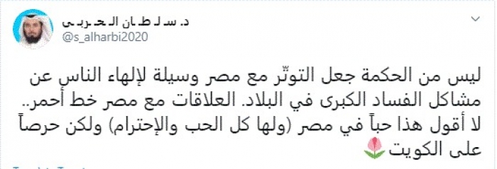 وكتب في تغريدة عبر "تويتر" رصدها "المشهد العربي": "ليس من الحكمة جعل التوتّر مع مصر وسيلة لإلهاء الناس عن مشاكل الفساد الكبرى في البلاد".