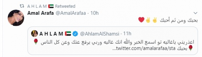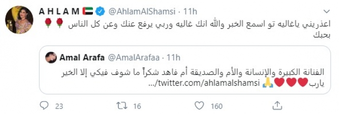 دعت الفنانة الإماراتية أحلام، لصديقتها الفنانة السورية أمل عرفة، والتي أعلنت أمس الإثنين، إصابتها بفيروس كورونا المستجد.