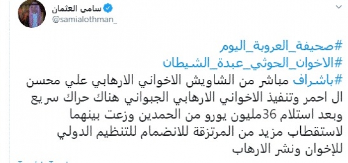 وقال في تغريدة عبر "تويتر" رصدها "المشهد العربي": "بإشراف مباشر من الشاويش الإخواني الإرهابي علي محسن الأحمر وتنفيذ الإخواني الإرهابي الجبواني".
