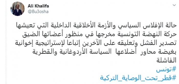 انتقد الإعلامي الإماراتي علي خليفة، اليوم، حركة النهضة التونسية، مؤكدًا أنها تعلق فشلها بتعليقه على الآخرين.
