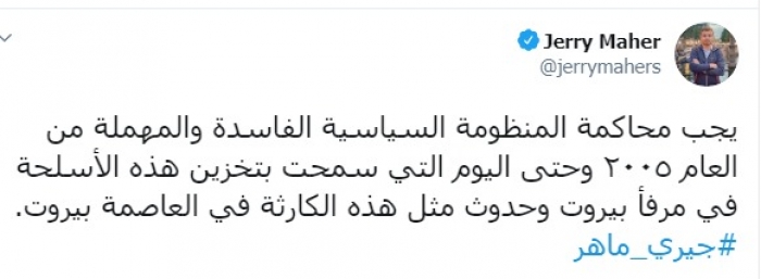 طالب الكاتب الصحفي اللبناني جيري ماهر، الثلاثاء، بمحاكمة المنظومة السياسية الفاسدة في لبنان منذ عام 2005 والتي سمحت بتخزين الأسلحة في مرفأ بيروت.