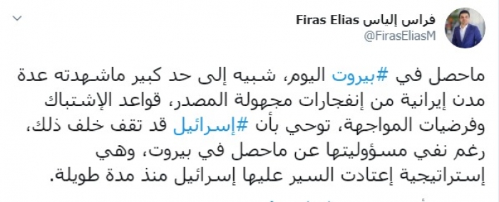 وكتب عبر تغريدة له على "تويتر" رصدها " المشهد العربي": " ما حصل في بيروت اليوم، شبيه إلى حد كبير ما شهدته عدة مدن إيرانية من انفجارات مجهولة المصدر، قواعد الاشتباك وفرضيات المواجهة، توحي بأن إسرائيل قد تقف خلف ذلك، رغم نفي مسؤوليتها عن ما حصل في بيروت، وهي استراتيجية اعتادت السير عليها إسرائيل منذ مدة طويلة".