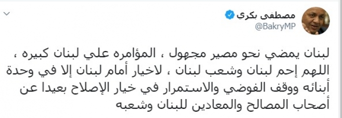 أكد البرلماني والإعلامي المصري مصطفى بكري، الثلاثاء، أن لبنان يمضي نحو مصير مجهول.