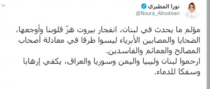 وكتبت عبر تغريدة لها على "تويتر" رصدها " المشهد العربي": "مؤلم ما يحدث في لبنان، انفجار بيروت هزّ قلوبنا وأوجعها، الضحايا والمصابين الأبرياء ليسوا طرفا في معادلة أصحاب المصالح والعمائم والفاسدين، ارحموا لبنان وليبيا واليمن وسوريا والعراق، يكفي إرهابا وسفكا للدماء".