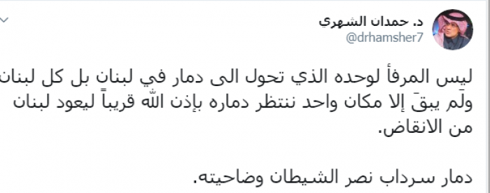 وكتب عبر تغريدة له على "تويتر" رصدها " المشهد العربي":" ليس المرفأ لوحده الذي تحول إلى دمار في لبنان بل كل لبنان ولَم يبقَ إلا مكان واحد ننتظر دماره بإذن الله قريباً ليعود لبنان من الانقاض، دمار سرداب نصر الشيطان وضاحيته".