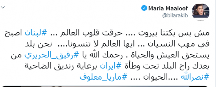 وكتبت عبر تغريدة لها على "تويتر" رصدها " المشهد العربي": "مش بس بكتنا بيروت، حرقت قلوب العالم، لبنان أصبح في مهب النسيان، أيها العالم لا تنسونا، نحن بلد يستحق العيش والحياة، رحمك الله يا رفيق الحريري من بعدك راح البلد تحت وطأة إيران برعاية زنديق الضاحية نصرالله...".