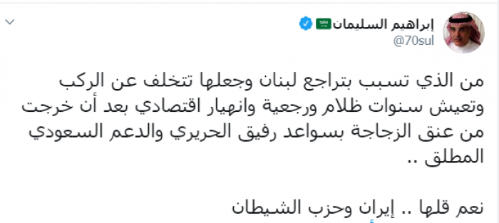 وكتب عبر تغريدة له على "تويتر" رصدها " المشهد العربي": "من الذي تسبب بتراجع لبنان وجعلها تتخلف عن الركب وتعيش سنوات ظلام ورجعية وانهيار اقتصادي بعد أن خرجت من عنق الزجاجة بسواعد رفيق الحريري والدعم السعودي المطلق، نعم قلها، إيران وحزب الشيطان".