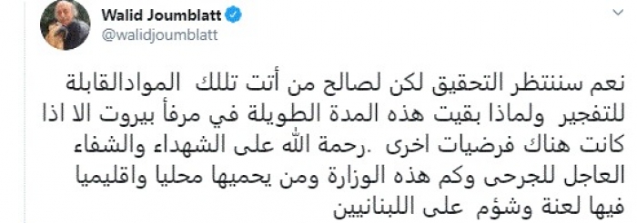 وقال في تغريدة عبر "تويتر" رصدها "المشهد العربي": "نعم سننتظر التحقيق لكن لصالح من أتت تلك المواد القابلة للتفجير ولماذا بقيت هذه المدة الطويلة في مرفأ بيروت إلا اذا كانت هناك فرضيات أخرى".