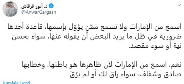 وقال في تغريدة عبر "تويتر" رصدها "المشهد العربي": " اسمع من الإمارات ولا تسمع ممّن يؤوِّل باسمها، قاعدة أجدها ضرورية في ظل ما يريد البعض أن يقوله عنها، سواء بحسن نية أو سوء مقصد".