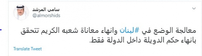 وقال في تغريدة عبر "تويتر" رصدها "المشهد العربي": "معالجة الوضع في لبنان وإنهاء معاناة شعبه الكريم تتحقق بإنهاء حكم الدويلة داخل الدولة فقط".