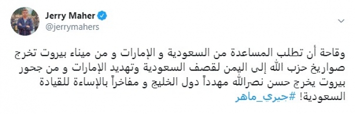 قال الكاتب الصحفي اللبناني جيري ماهر، اليوم، إن صواريخ حزب الله تخرج من مطار بيروت إلى اليمن لتهديد السعودية والإمارات، منتقدًا صمت الحكومة اللبنانية على أفعال حزب الله.
